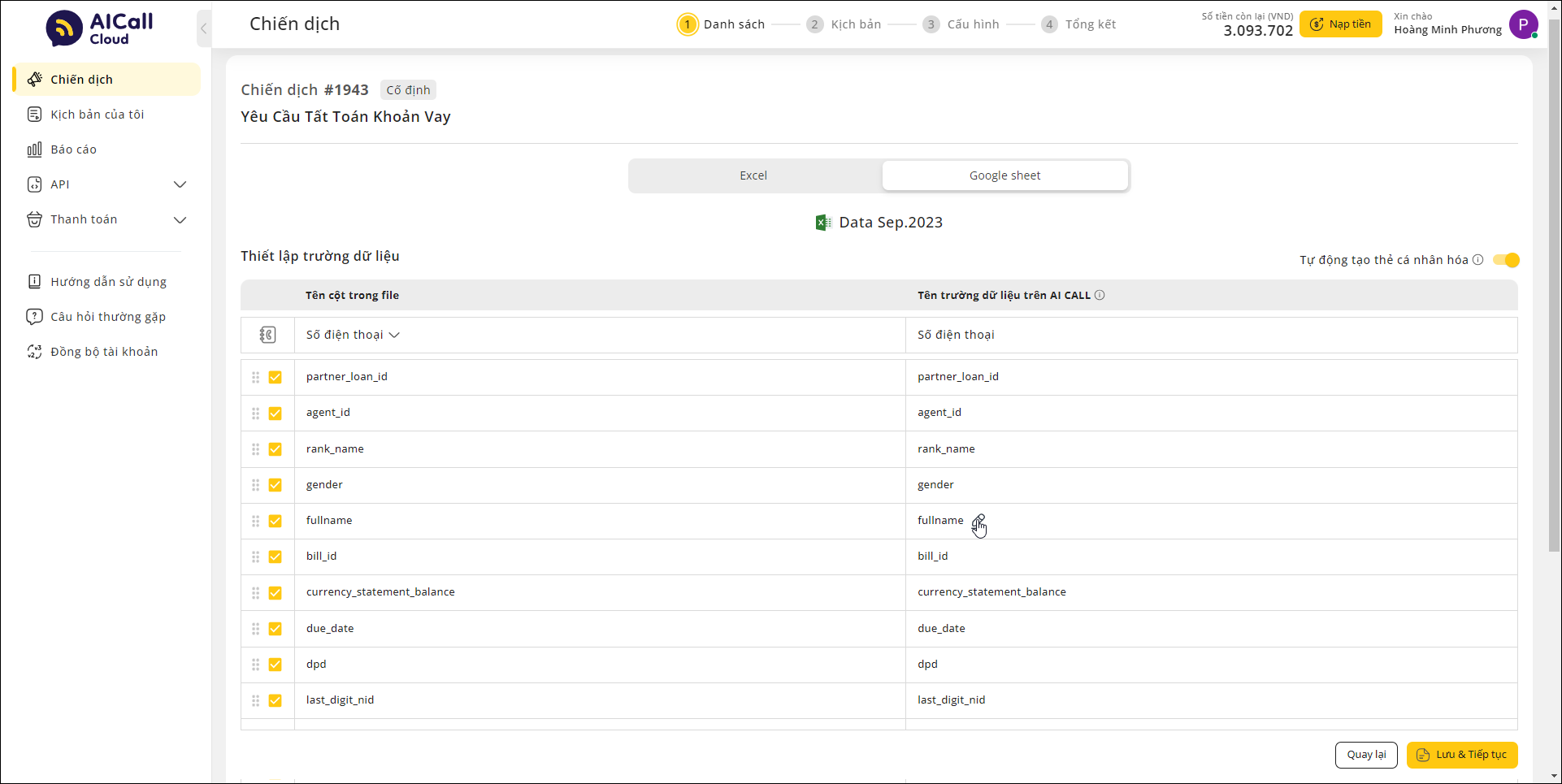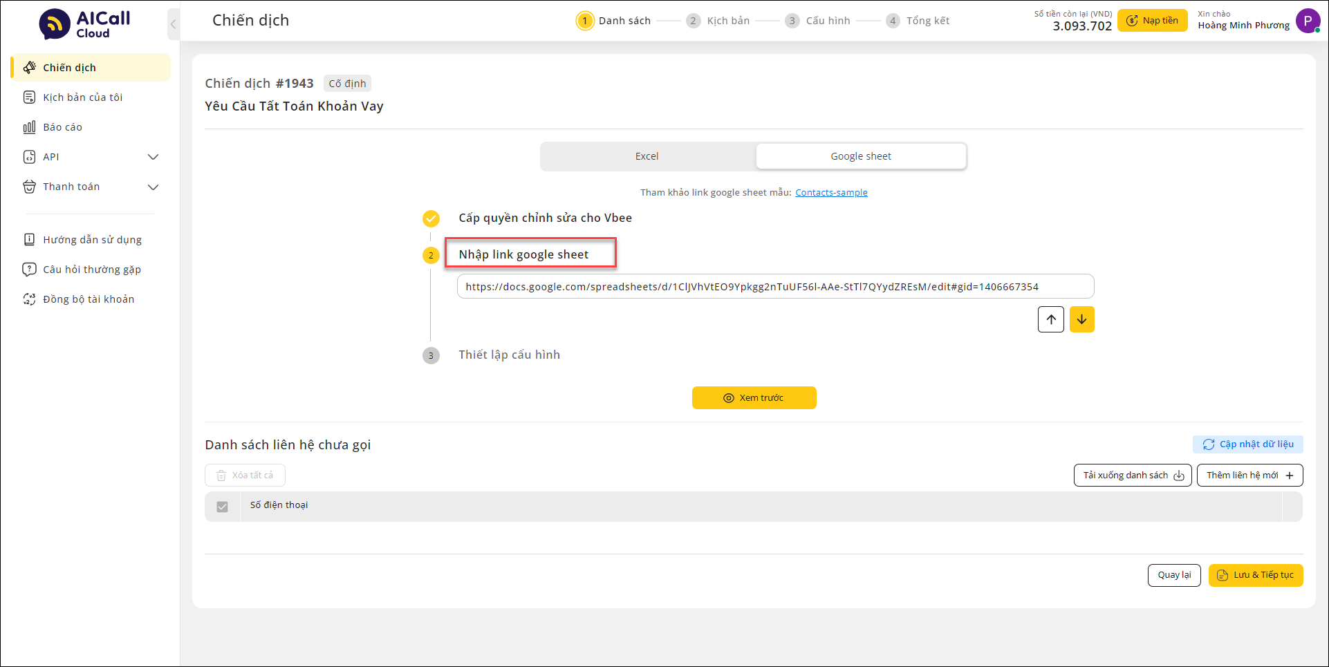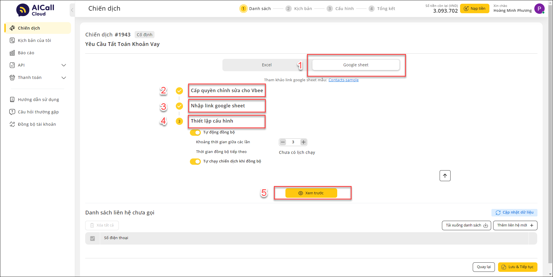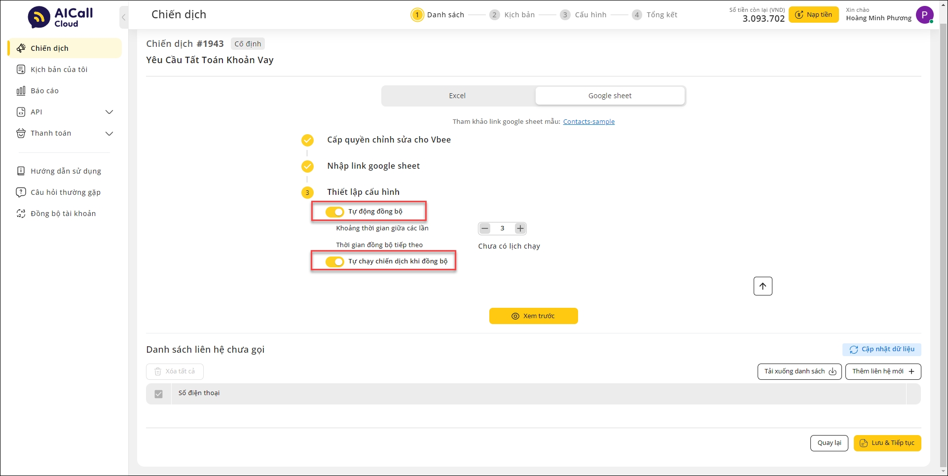 Bước 3: Thiết lập cấu hình : Người dùng có thể thiết lập các cấu hình sau khi tích hợp google sheet như Hệ thống có tự động đồng bộ dữ liệu từ File google sheet lên hệ thống AICall Cloud không? Nếu hệ thống tự động đồng bộ dữ liệu thì Khoảng thời gian giữa các lần đồng bộ là bao nhiêu phút từ đó người dùng có thể biết được Thời gian đồng bộ tiếp theo là lúc nào. Ngoài ra, người dùng cũng có thể thiết lập chế độ cho hệ thống có tự động chạy chiến dịch khi đồng bộ hay không. Nếu người dùng bật switch Tự chạy chiến dịch khi đồng bộ thì sau khi đồng bộ, chiến dịch sẽ tự động gọi và ngược lại nếu người dùng tắt switch Tự chạy chiến dịch khi đồng bộ thì sau khi đồng bộ, chiến dịch sẽ không tự động gọi đến danh sách khách hàng đã đồng bộ cho đến khi người dùng nhấn nút Chạy chiến dịch.
