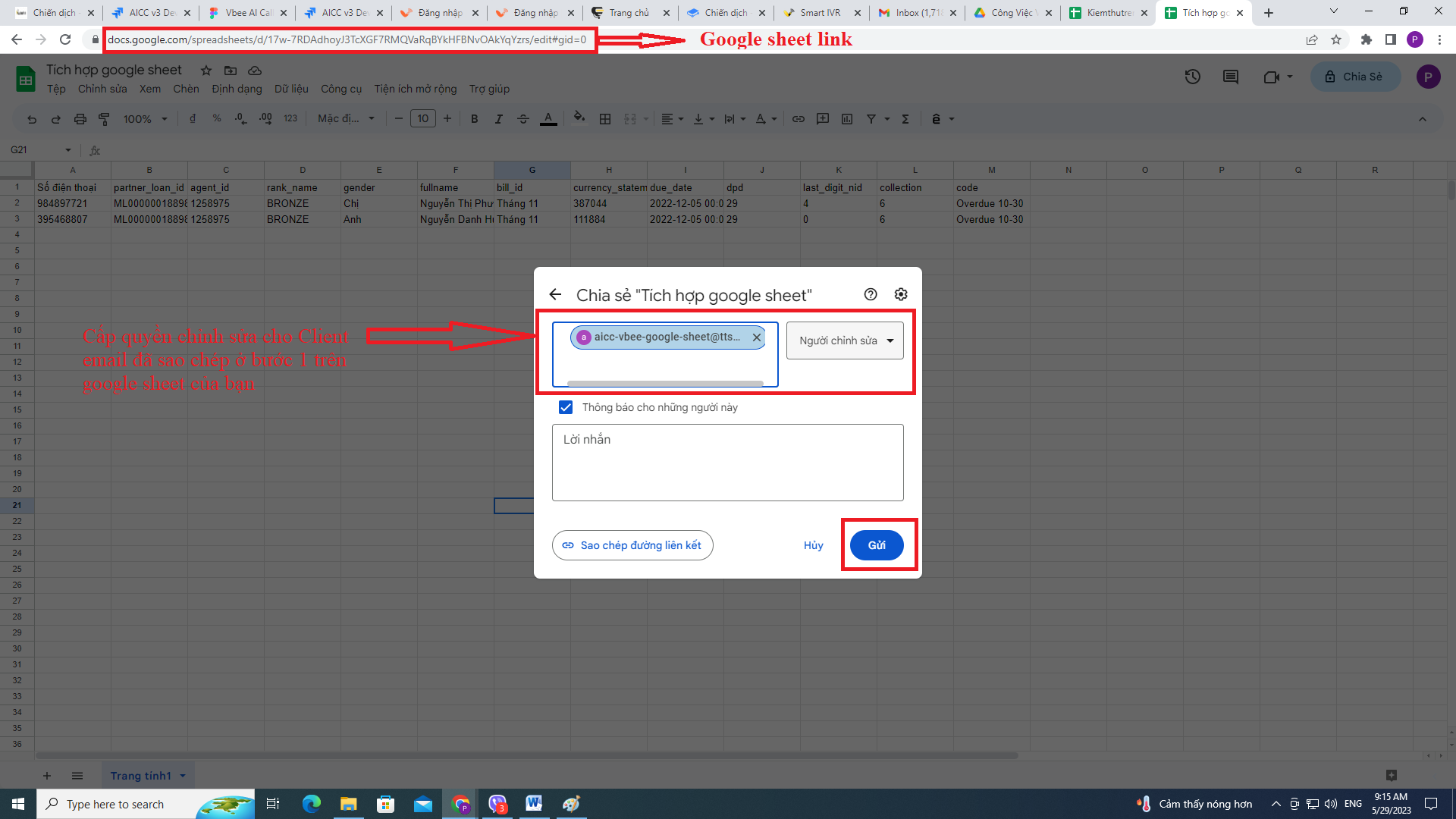 Bước 1: Sao chép thông tin Client email và Cấp quyền chỉnh sửa cho Client email đã sao chép trên google sheet của bạn