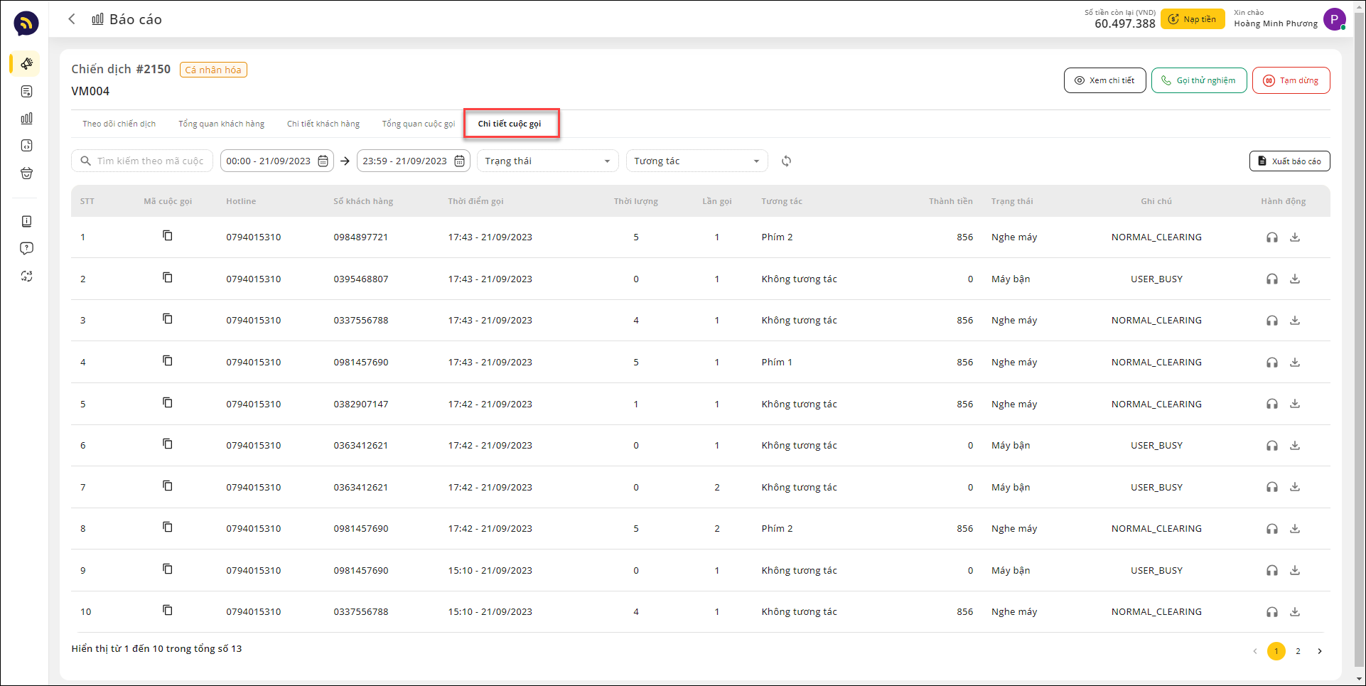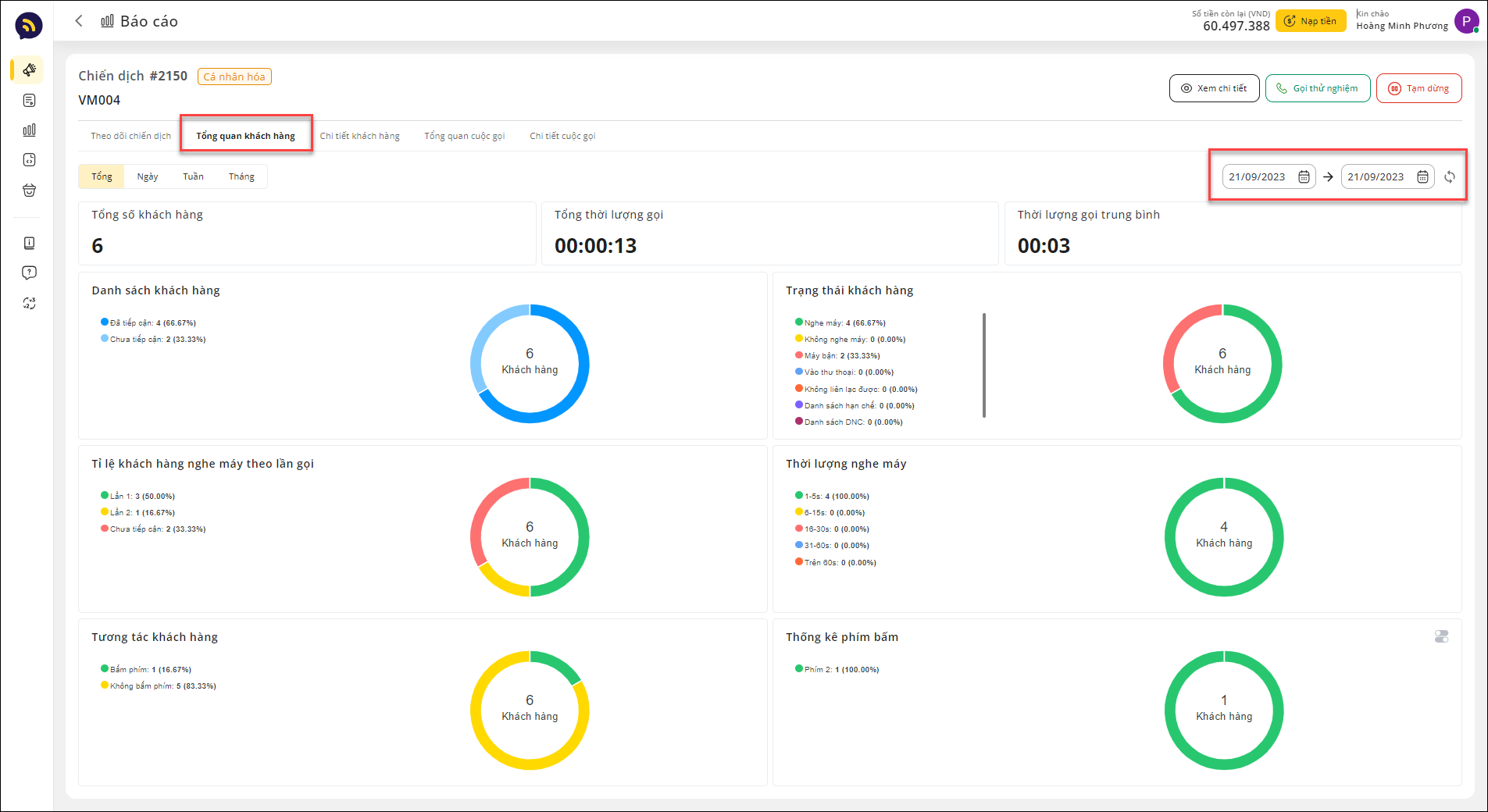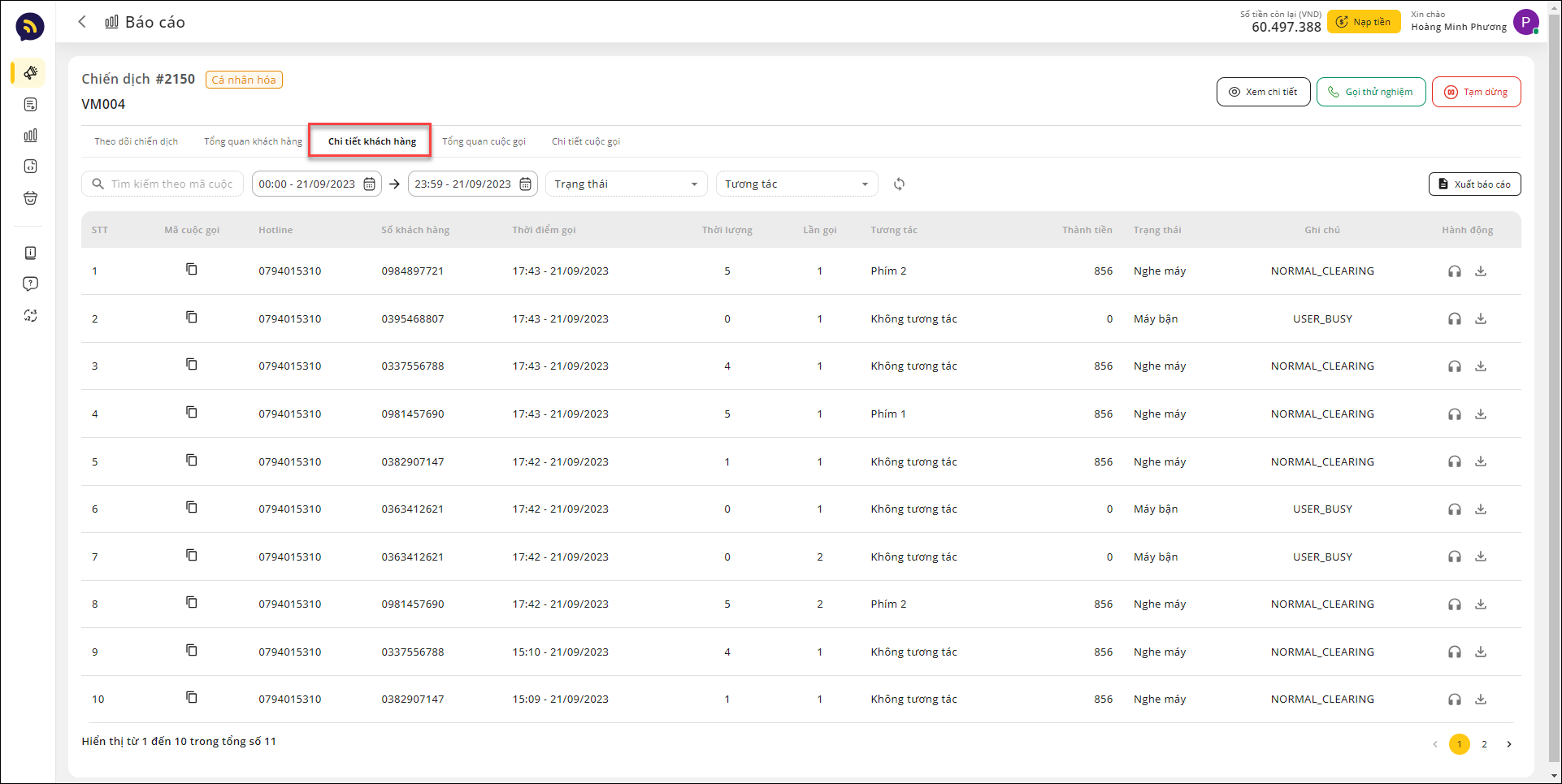 Tổng số khách hàng: Tổng số lượng khách hàng mà người dùng đã thực hiện gọi ra trong khoảng thời gian tìm kiếm bao gồm cả những khách hàng gọi thử nghiệm.