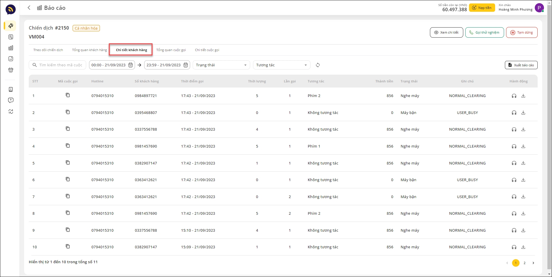 Lưu ý : Nếu 1 khách hàng được gọi nhiều lần, kết quả báo cáo sẽ ghi nhận cuộc gọi có kết quả tốt nhất. Ví dụ lần gọi thứ 1 gọi đến cho khách hàng máy bận, lần gọi thứ 2 gọi đến cho khách hàng thì khách hàng không nghe máy, lần gọi thứ 3 gọi đến cho khách hàng và khách hàng nghe máy 15 giây thì báo cáo sẽ ghi nhận kết quả của cuộc gọi thứ 3 vào tab Chi tiết khách hàng.