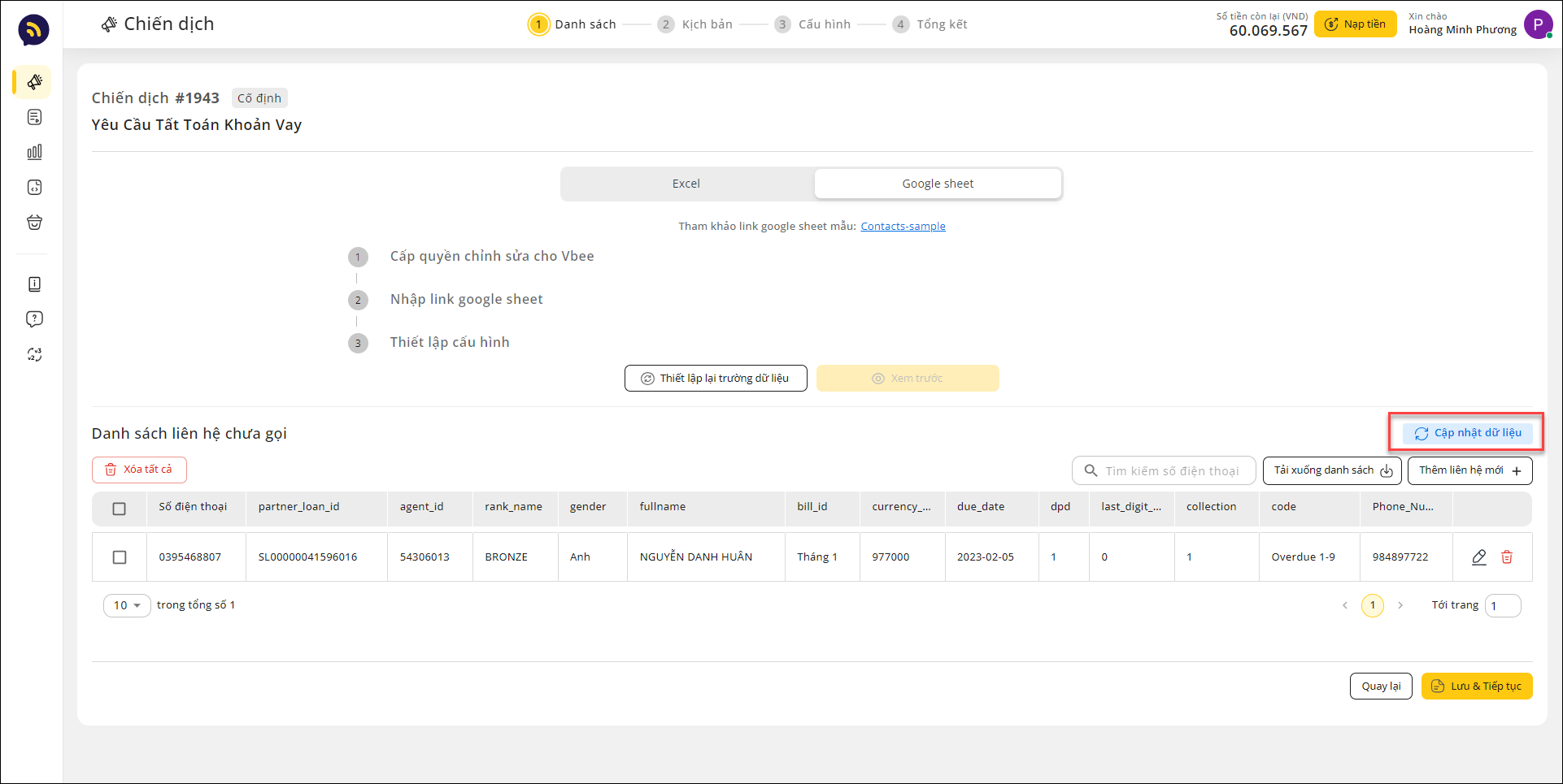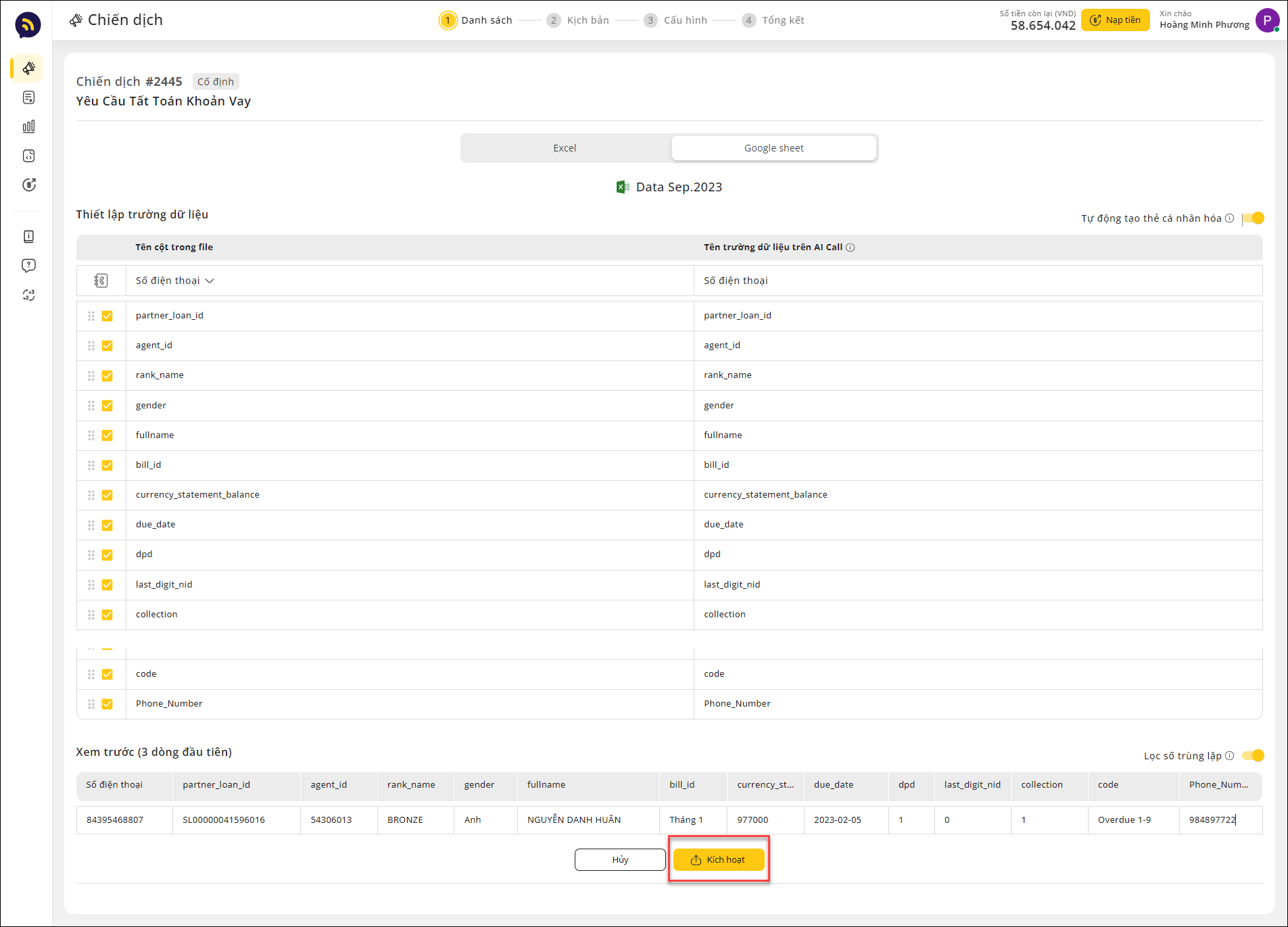 Bước 5: Sau khi kiểm tra dữ liệu xem trước đã chính xác thì người dùng nhấn nút Kích hoạt để hoàn tất quá trình tích hợp google sheet. Sau khi nhấn nút Kích hoạt, người dùng thực hiện nhấn icon Cập nhật dữ liệu để xem kết quả dữ liệu sau khi người dùng thực hiện tích hợp lên hệ thống.