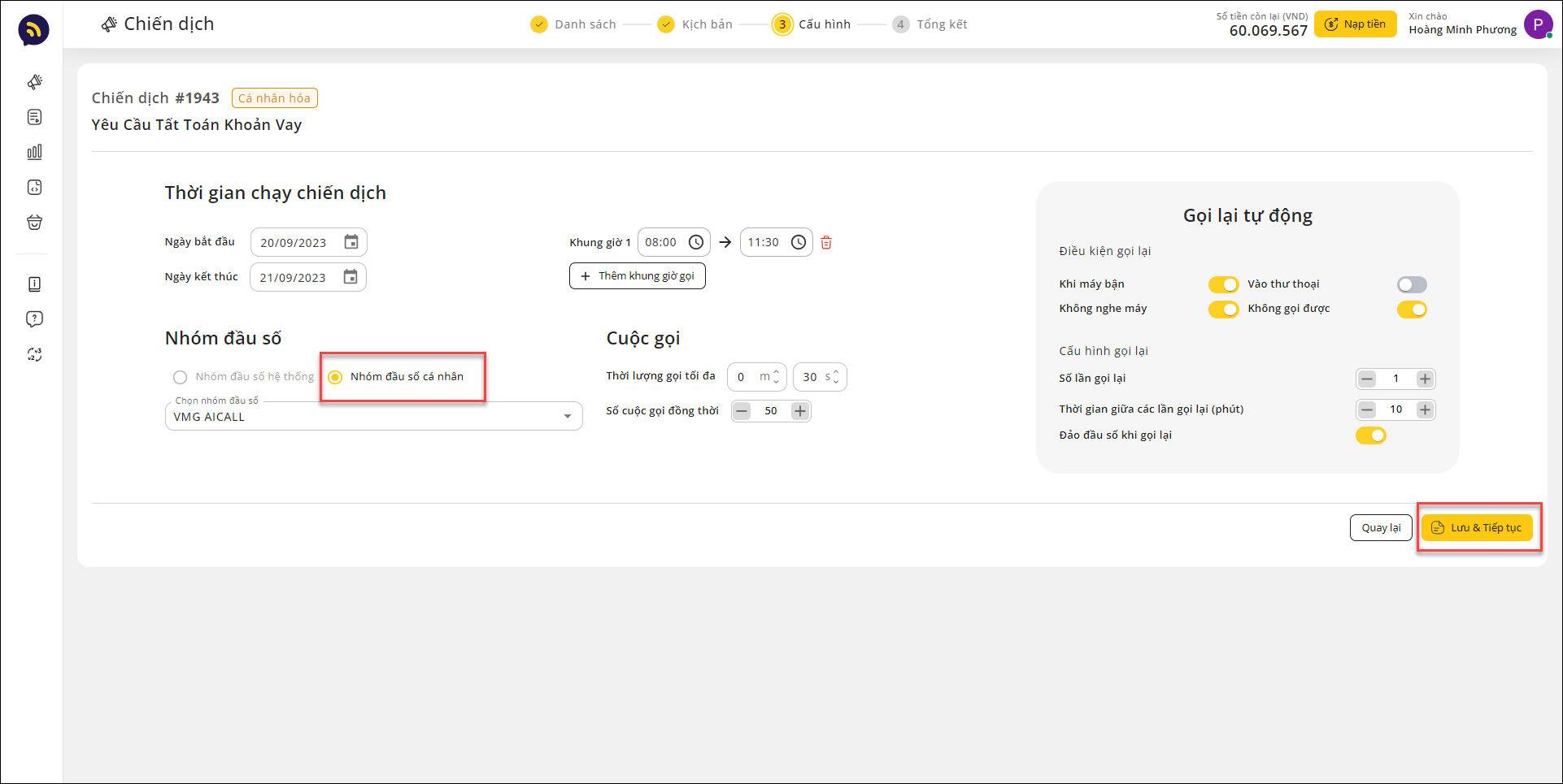 Sau khi cấu hình xong bước Kịch bản, người dùng nhấn nút Lưu & Tiếp tục để chuyển sang bước Cấu hình. Tại bước Cấu hình, người dùng thực hiện cấu hình cho chiến dịch, chọn nhóm đầu số gọi ra; Ngày bắt đầu chiến dịch (Ngày/Tháng/Năm); Khung giờ gọi trong ngày (Khung giờ 1, Khung giờ 2,…); Số cuộc gọi đồng thời; Thời lượng cuộc gọi tối đa; Cấu hình gọi lại khi máy bận hoặc không nghe máy, vào thư thoại, không gọi được. Cấu hình số lần gọi lại, Khoảng thời gian giữa hai lần gọi lại, Đảo đầu số khi gọi lại ( Tức là số hotline gọi đến khách hàng A lần thứ 1 sẽ khác số hotline gọi đến khách hàng A lần thứ 2, thứ 3...).
