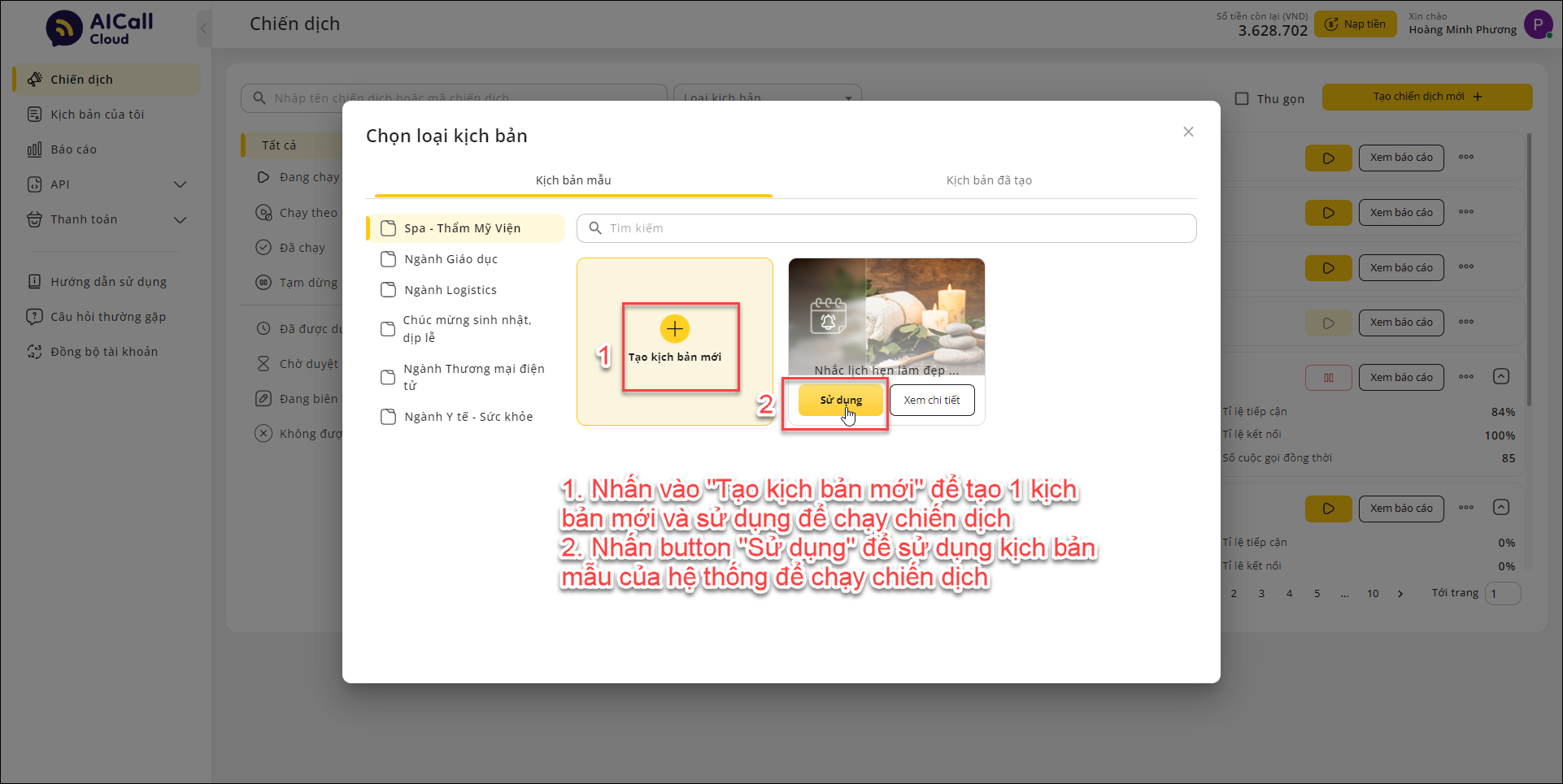 Sau khi nhấn nút Tạo chiến dịch mới, hệ thống hiển thị màn hình Chọn loại kịch bản, người dùng chọn sử dụng một kịch bản mẫu của hệ thống để sử dụng bằng cách chọn kịch bản mẫu hệ thống sau đó nhấn vào button Sử dụng hoặc chọn một kịch bản mà người dùng đã tạo trong tab Kịch bản đã tạo và nhấn vào button Sử dụng . Ngoài ra, người dùng cũng có thể tạo ra một kịch bản mới để sử dụng chạy chiến dịch bằng cách nhấn vào button Tạo kịch bản mới .