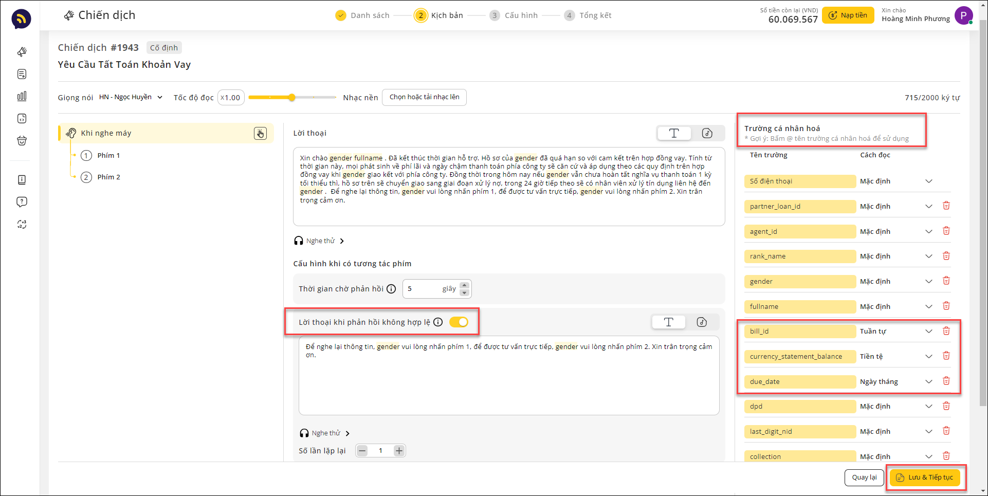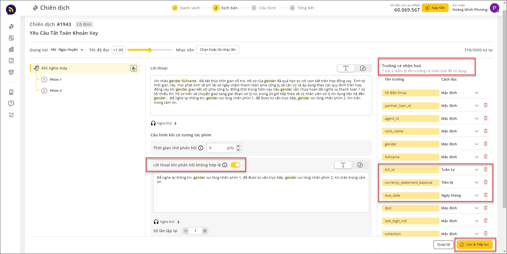 Bước Kịch bản cho phép chỉnh sửa lại thông tin Tên chiến dịch, cấu hình các thông tin như : Lời thoại khi nghe máy; nội dung phản hồi trong cuộc gọi. Người dùng có thể tùy chỉnh nhập nội dung lời thoại khi người nghe nhấc máy hoặc tải lên File ghi âm có sẵn, chọn giọng nói và tốc độ của giọng nói cho cuộc gọi, chèn nhạc nền đồng thời có thể nghe thử nội dung cuộc gọi trước khi khởi tạo chiến dịch.