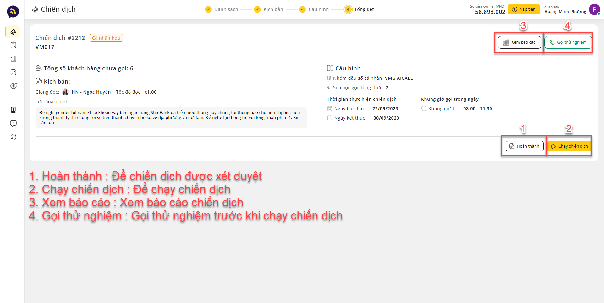 Tại bước Tổng kết, người dùng có thể thực hiện nhấn nút Chạy chiến dịch để chạy chiến dịch hoặc nhấn nút Hoàn thành để chiến dịch được xét duyệt nội dung kịch bản trước khi người dùng sẵn sàng cho việc chạy chiến dịch.