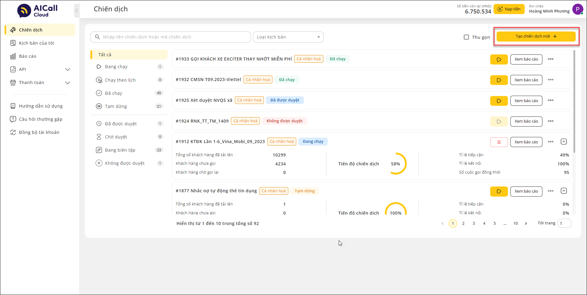 Để khởi tạo một chiến dịch, người dùng nhấn vào chức năng Tạo chiến dịch mới.