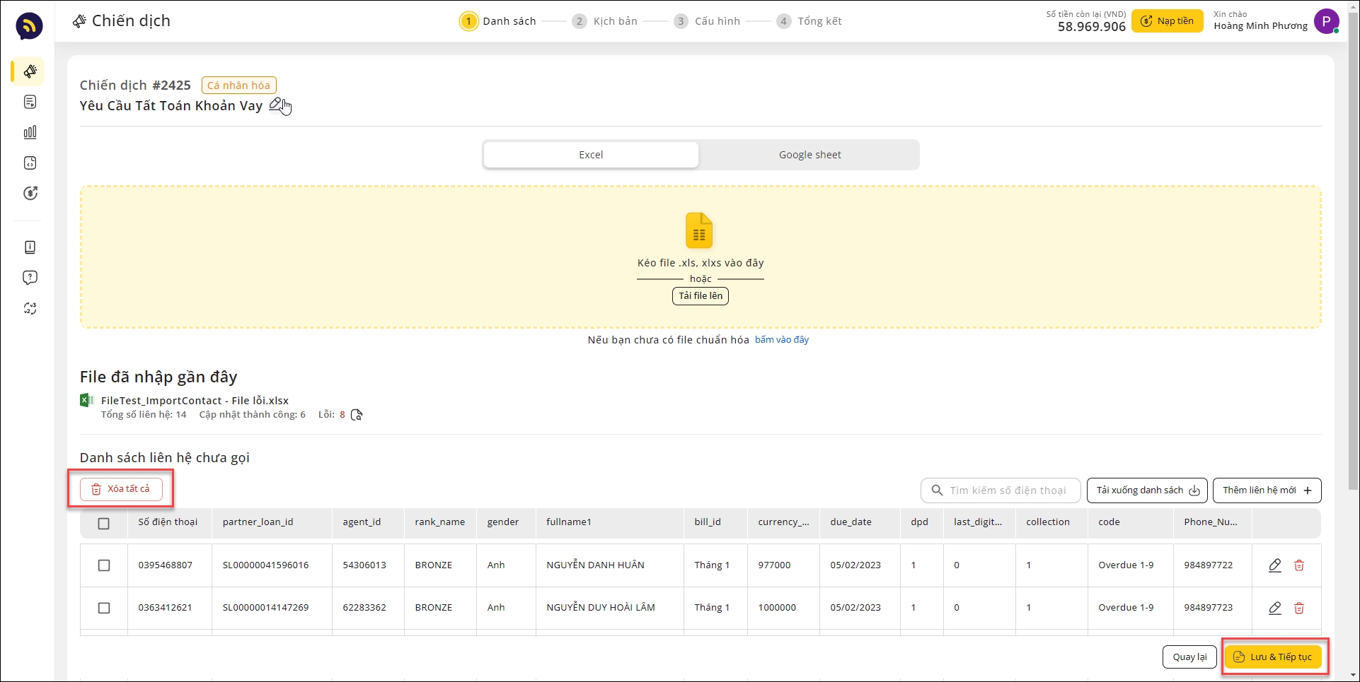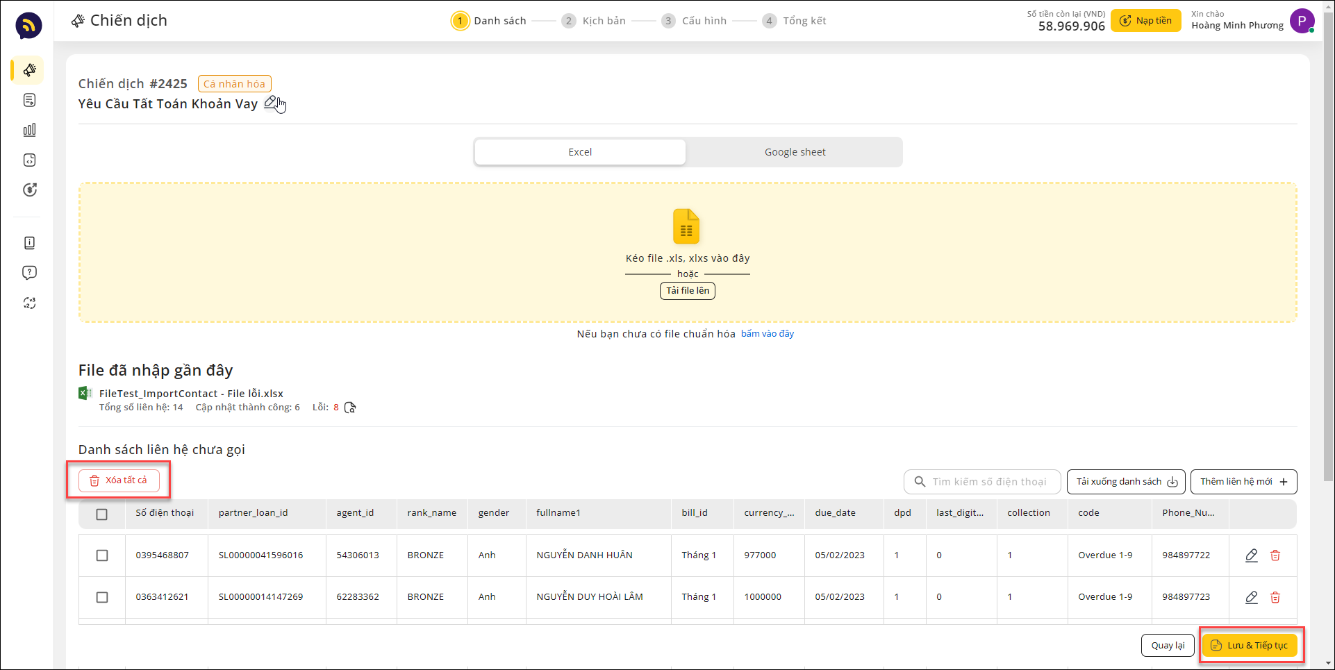 Sau khi đã upload file danh sách khách hàng. Người dùng nhấn nút Lưu & Tiếp tục để chuyển sang bước 2 : Kịch bản.