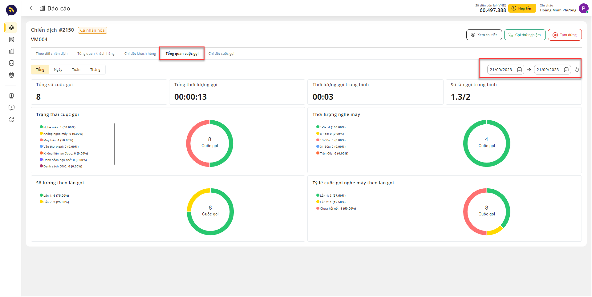 Báo cáo thống kê số liệu từ tất cả các cuộc gọi ra trong khoảng thời gian nhất định, bao gồm các chỉ tiêu Tổng số cuộc gọi, Tổng thời lượng gọi, Thời lượng gọi trung bình và các chỉ tiêu phản ánh hiệu suất chiến dịch như Số lần gọi trung bình, Tỷ lệ khách hàng đã tiếp cận, tỷ lệ khách hàng chưa tiếp cận, Tỉ lệ khách hàng nghe máy theo lần gọi.... Giao diện báo cáo gồm 2 phần chính: