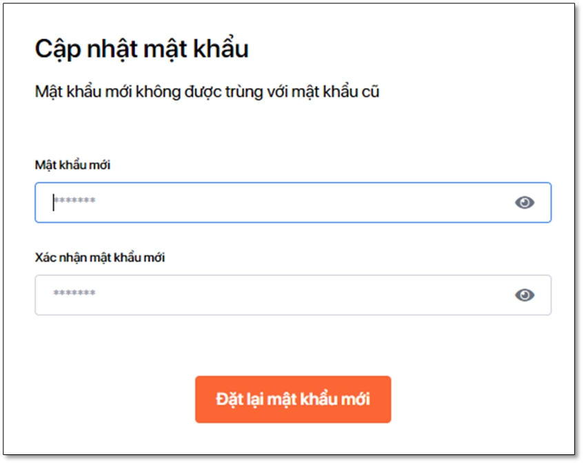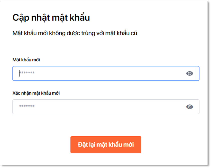 Sau khi nhấn nút Tiếp tục, hệ thống chuyển sang màn hình Đặt lại mật khẩu cho phép người dùng đặt lại mật khẩu mới để thay thế cho mật khẩu mà mình đã quên. Người dùng thực hiện nhập vào 2 trường thông tin sau: