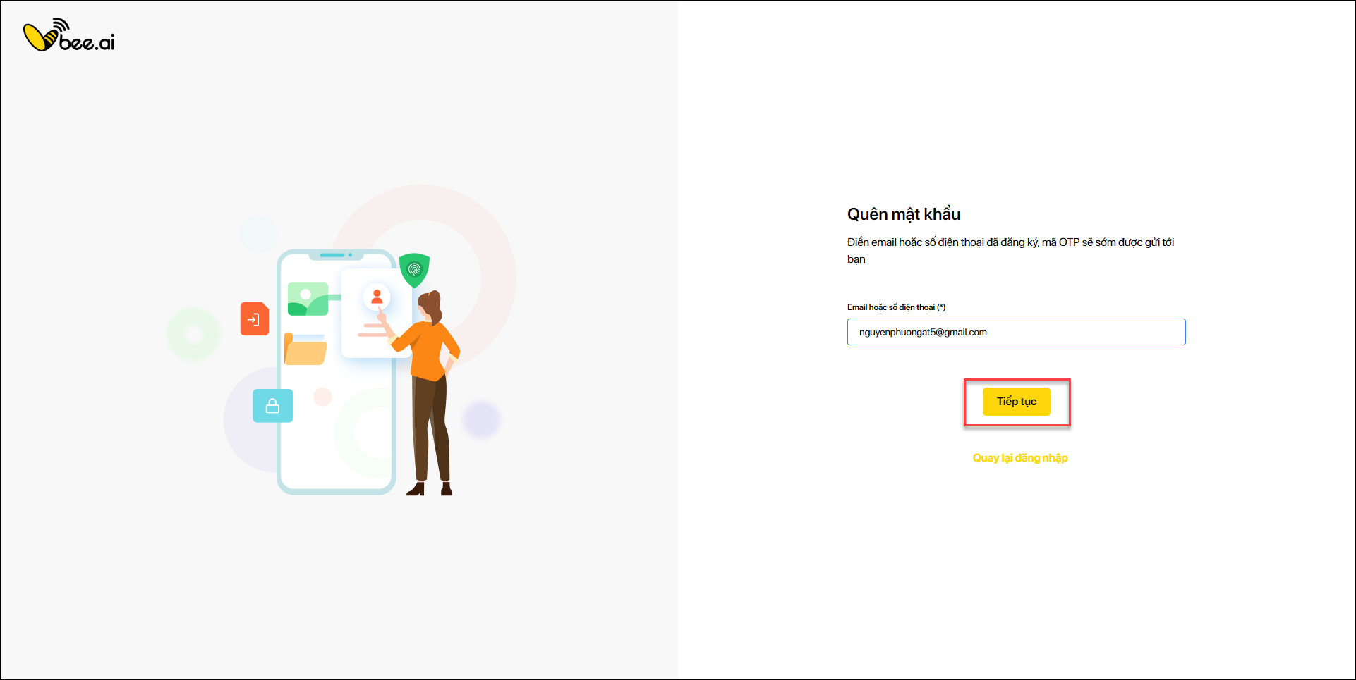 Hình ảnh : Màn hình Quên mật khẩuHệ thống Vbee AICall Cloud sẽ gửi thực hiện gửi một email tới email mà khách hàng đã đăng ký để cung cấp một mã OTP nhằm xác thực email của người dùng. Khách hàng vui lòng nhập mã CODE vào textbox Mã OTP sau đó nhấn nút Tiếp tục để chuyển sang bước tiếp theo của chức năng Quên mật khẩu.