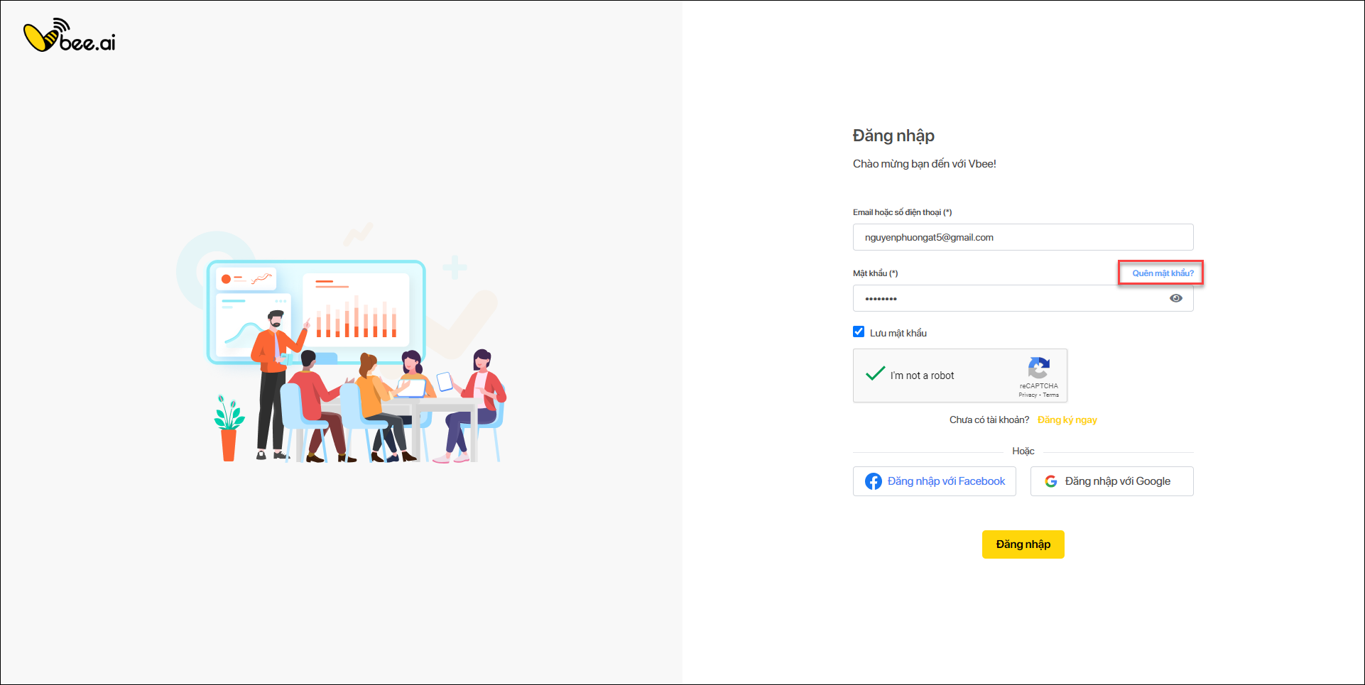 Trường hợp Quên mật khẩu, Vbee hỗ trợ đặt lại với tài khoản đăng ký bằng email. Trường hợp người dùng Đăng nhập Facebook và Google, nếu Quên mật khẩu thì người dùng thực hiện đặt lại ở Facebook hoặc Google